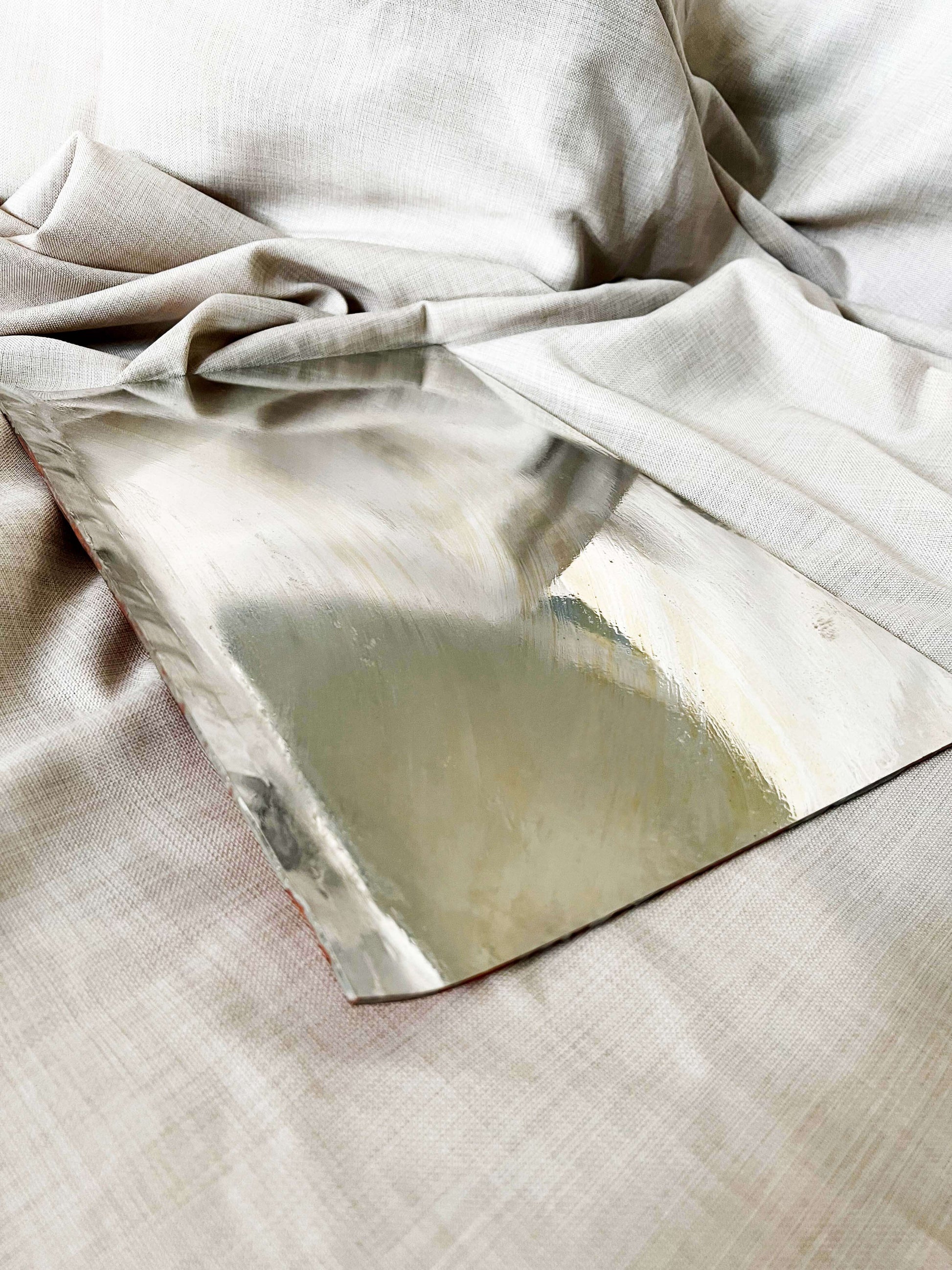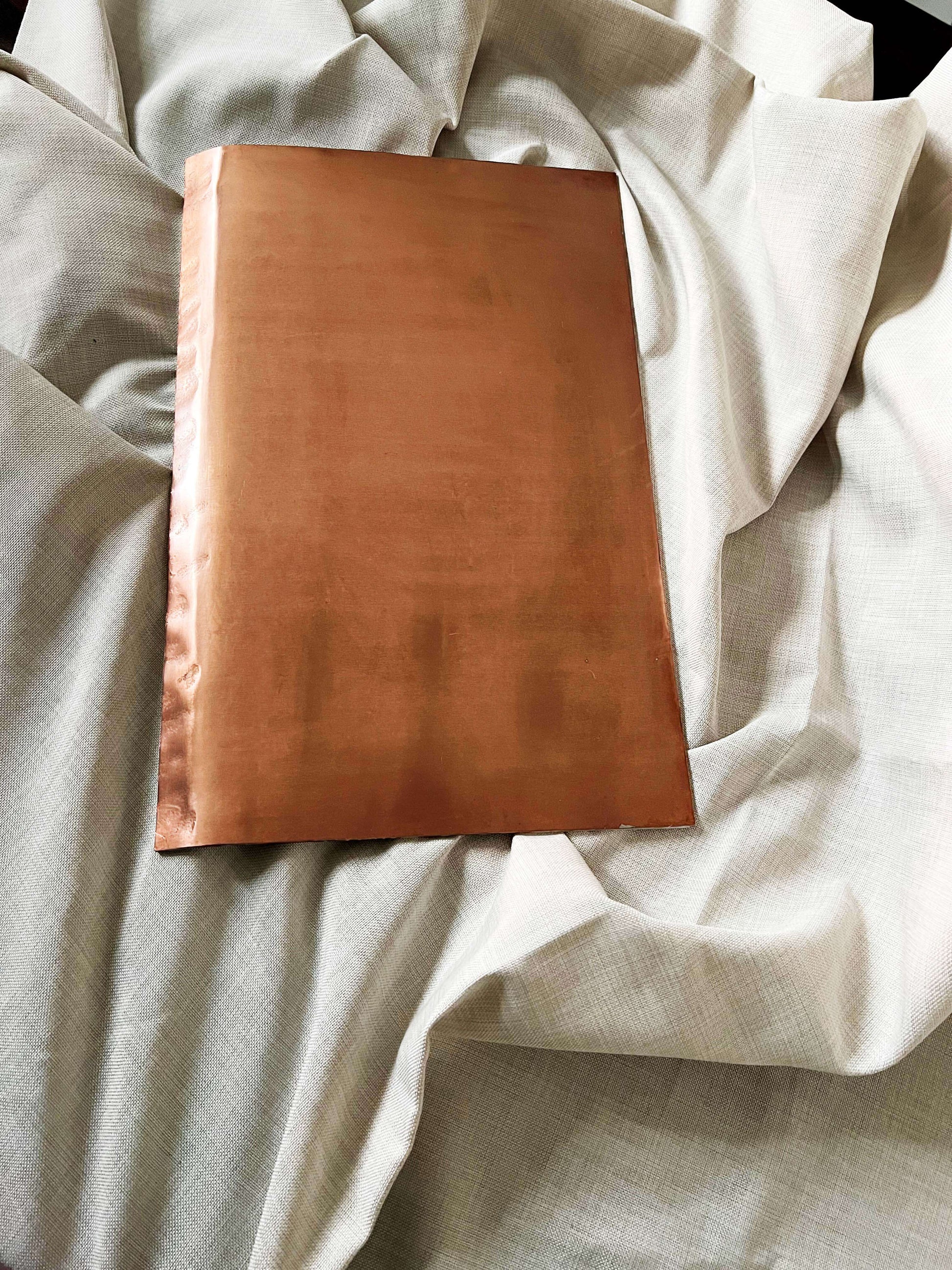 The amount of copper used in this cookie sheet is tremendous! This extremely heavy copper cookie sheet weighs in over 8lbs, and is made from 3mm thick copper. One side is hand-hammered over the anvil to a 45-degree angle to allow for an easier grip to pull from the oven. I hand-wipe them with food-safe tin and voila!